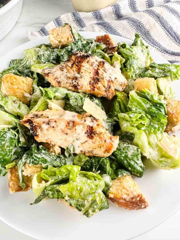 And yes, you can make this chicken Caesar salad recipe with homemade croutons, homemade Caesar dressing (ours is raw egg and anchovie free!) and grilled Italian chicken or you can short cut it with your favorite storebought dressing and croutons.