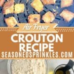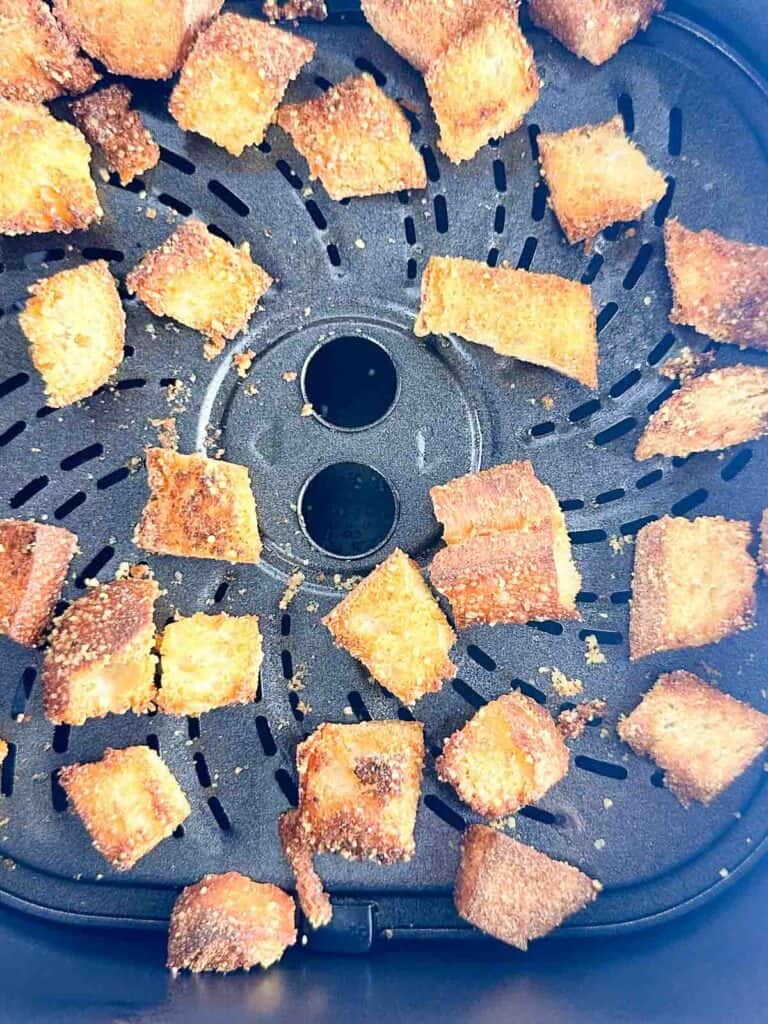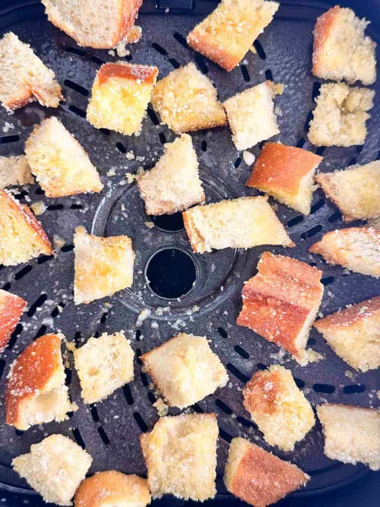 - Cook the croutons for 6 to 10 minutes or until they turn golden brown and toasted, shaking the basket halfway through the cooking process.