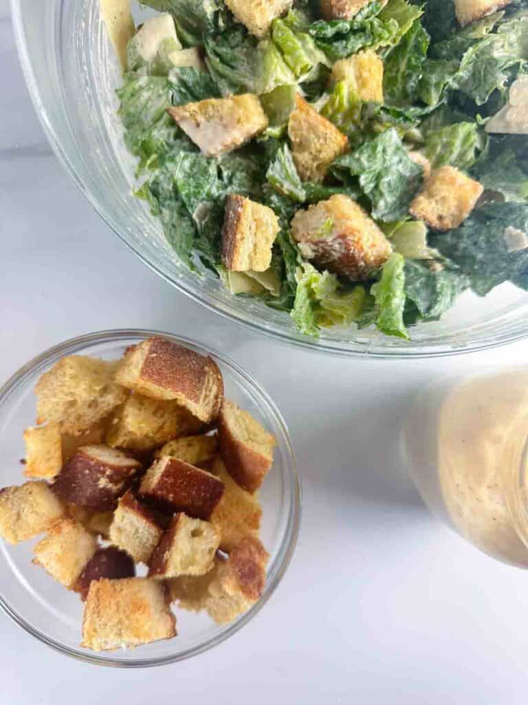 These croutons are perfect for Caesar salads and compliment our homemade Caesar dressing nicely or you can add them to a buffalo chicken Caesar salad.