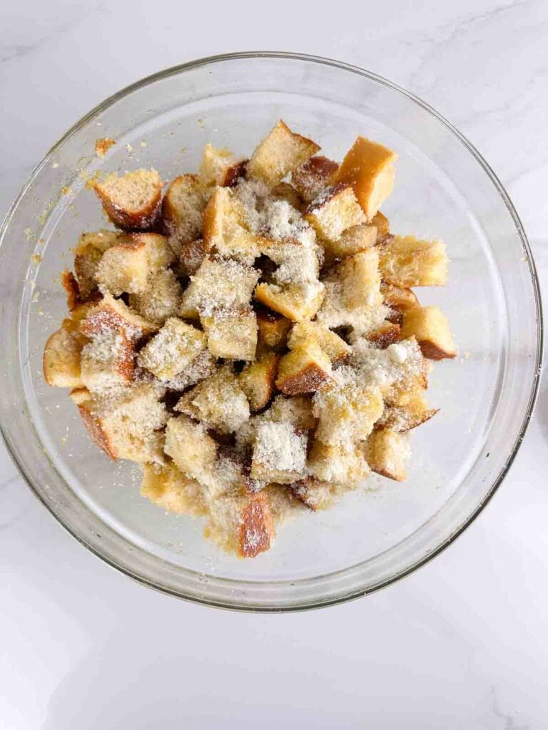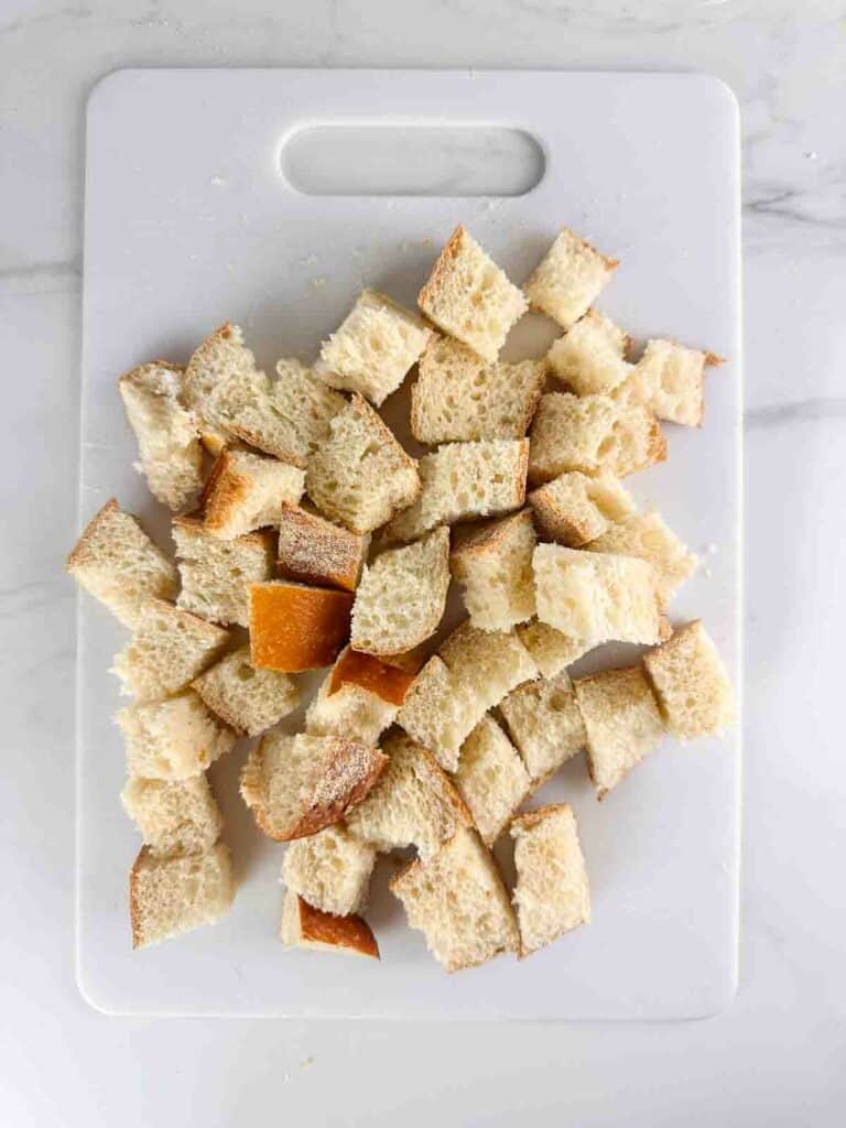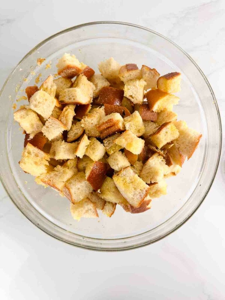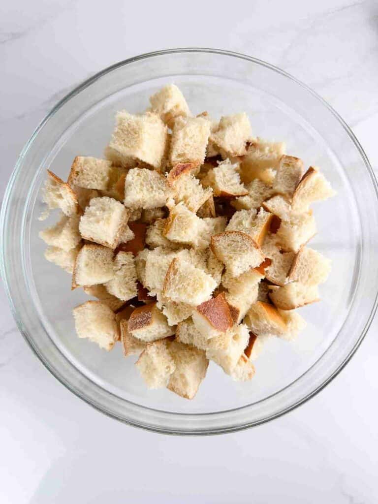 - Cut your bread into roughly 1×1 inch cubes and place into a large mixing bowl.