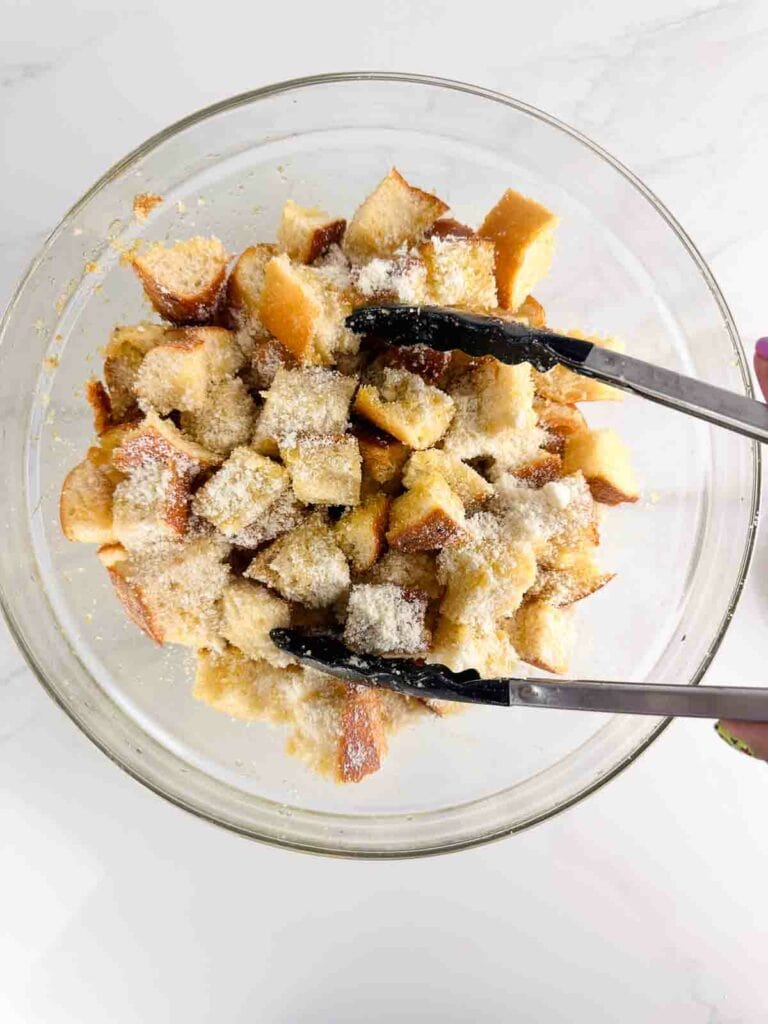 - Use tongs or a spoon to gently toss the bread cubes to coat them.