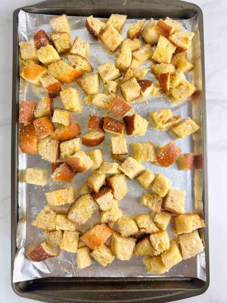- Spread the bread cubes evenly over the prepared cookie sheet.