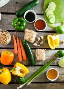 Thai-Chili-Lime-Noodles-1 bell peppers, carrots, zucchini, siracha, soy sauce, honey, ginger, peanuts, lime, and garlic