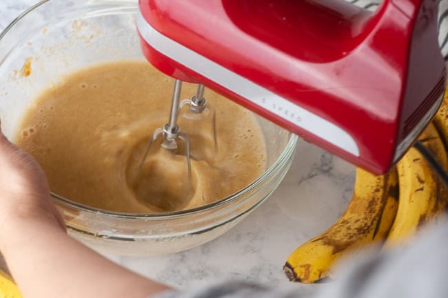 - Once the oven is hot, you can start on the wet ingredients. In a large mixing bowl, mash the peeled bananas either with a hand mixer, a fork or a potato mixer. When they are lightly mashed, add the sugars, oil, milk, vanilla and egg to the bowl with the mashed bananas. Use a hand mixer to mix together until everything is combined evenly.