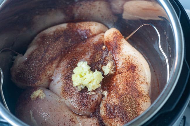 - Add the chicken breasts to the Instant Pot on the trivet. Pour in the chicken stock. Season the chicken with 2 tsp chili powder, 1 tsp cumin, and salt and pepper to taste. Add the pressed garlic. Pour on the juice of 2 limes. Secure the lid of the Instant Pot, making sure the valve is set to sealing. Pressure cook on high for 15 minutes and do a natural release for 10 minutes. Quick release any of the remaining pressure. Drain half of the liquid from the Pot. Remove the chicken from the Pot and shred.