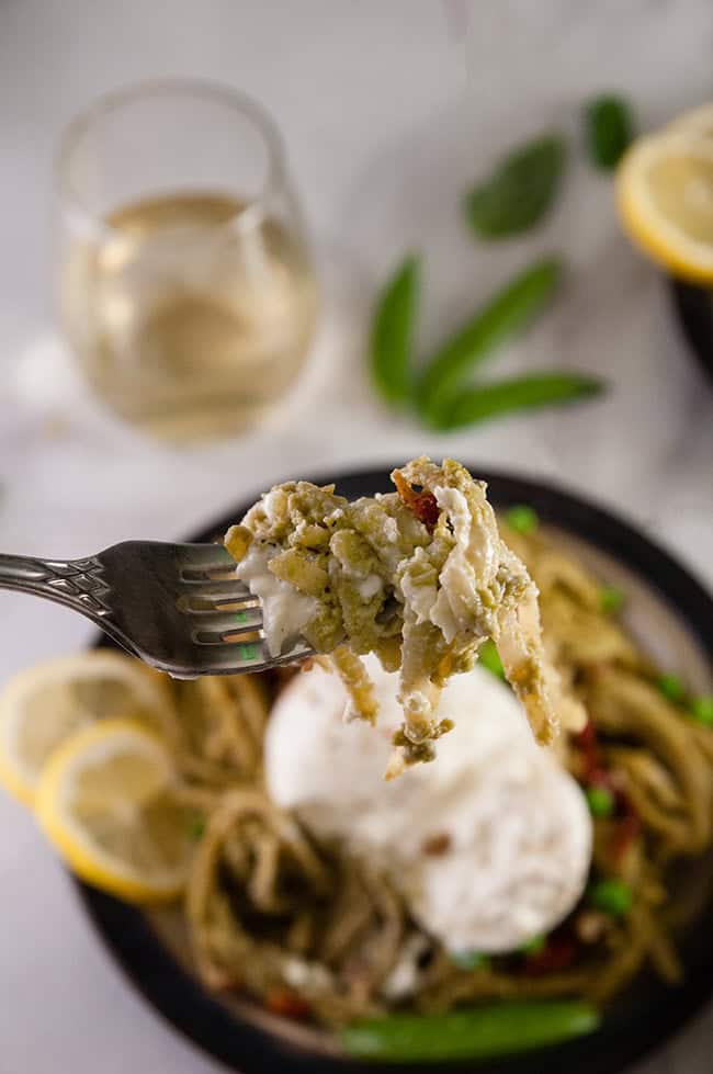 There’s something about this time of year that has me craving pasta. I’m not much for really heavy meat sauces as we creep forward into spring. I want something lighter and springy like this pea pesto pasta with burrata and sun dried tomatoes.