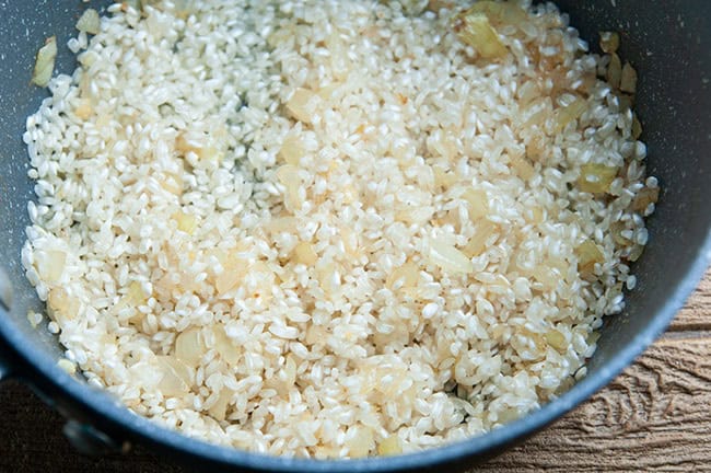 - Once the onions have softened, add 1 cup of Arborio rice directly to the pot. Cook for about 90 seconds, stirring to coat it in the butter.